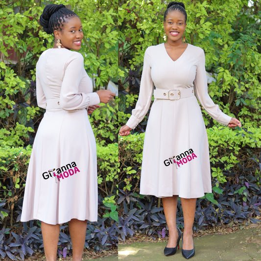 Beige Belted Sleeved Skater Dress