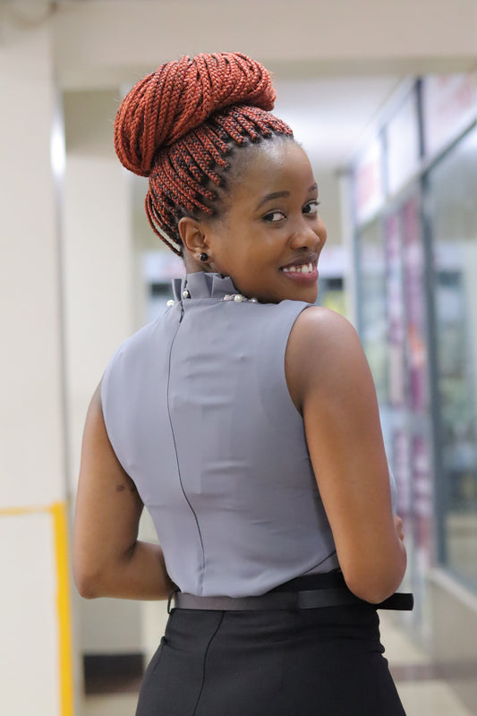 Pearl Embellished Frilled Grey Blouse
