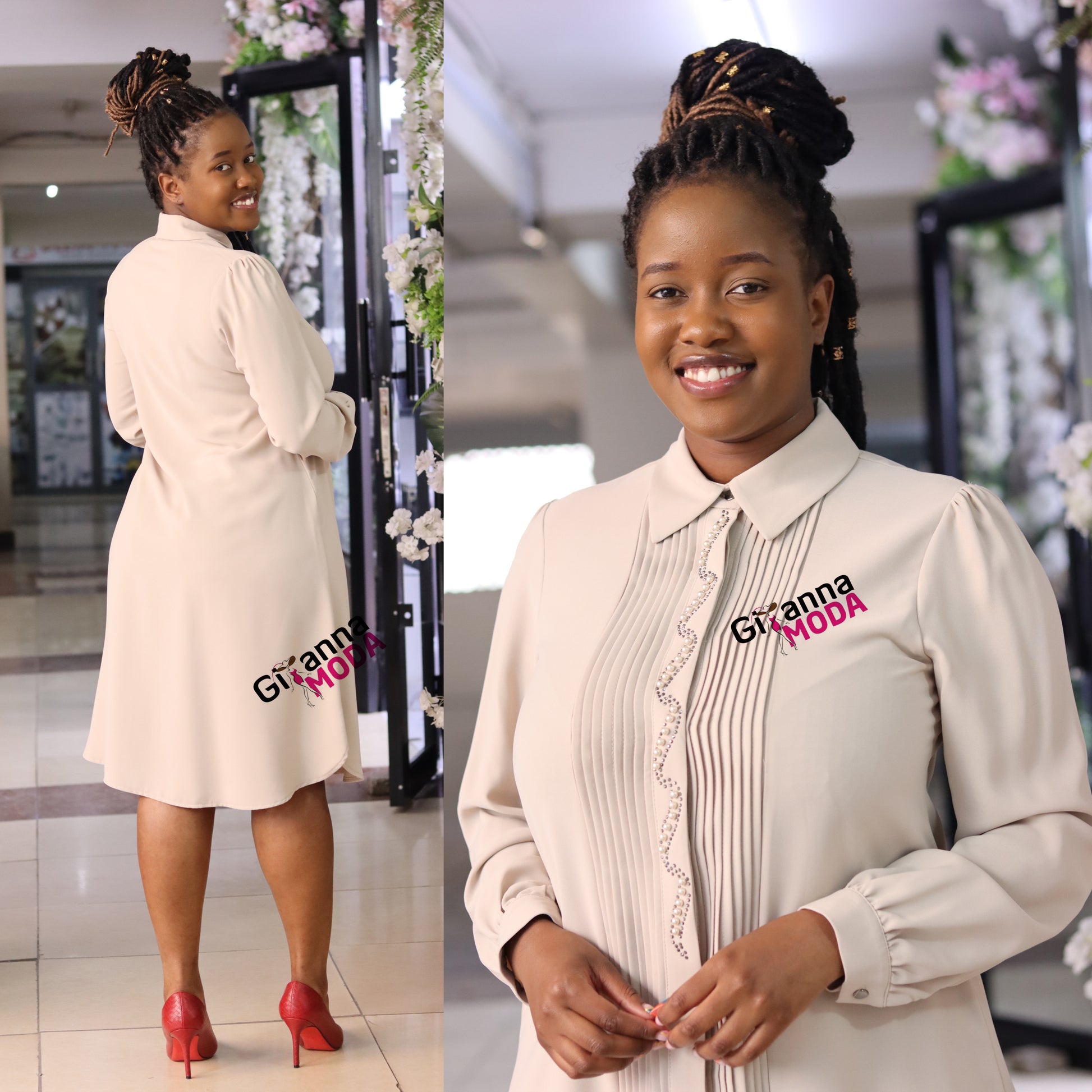 Beige Collared Long Sleeved Dress