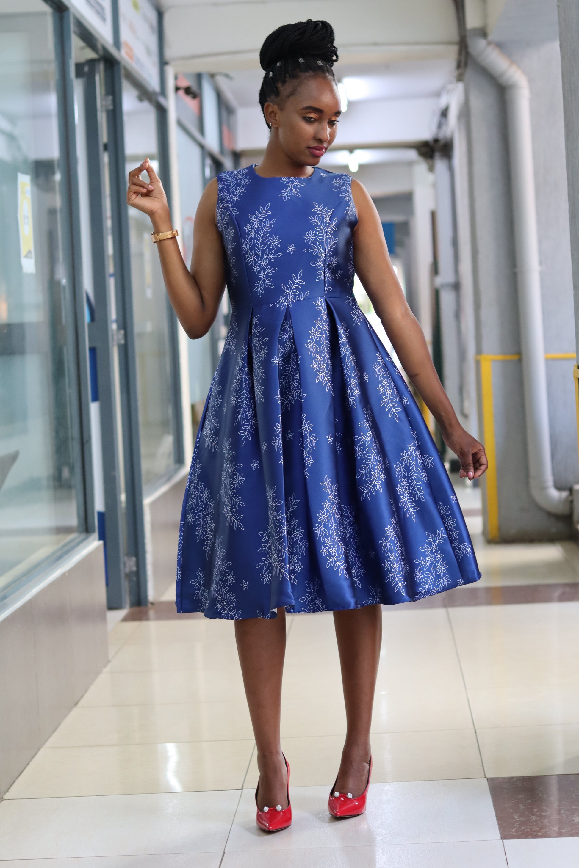 Blue Floral Pleated Skater Dress