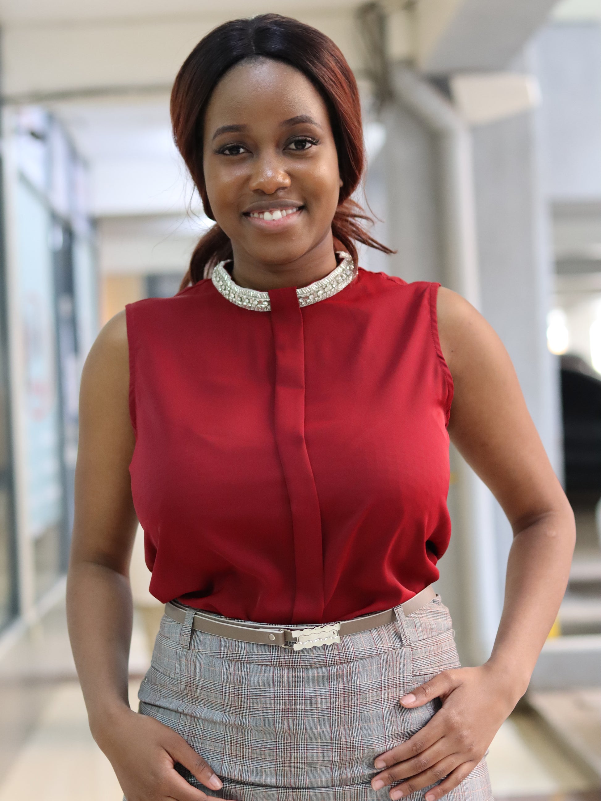 Embellished Crew Neck Burgundy Sleeveless Blouse