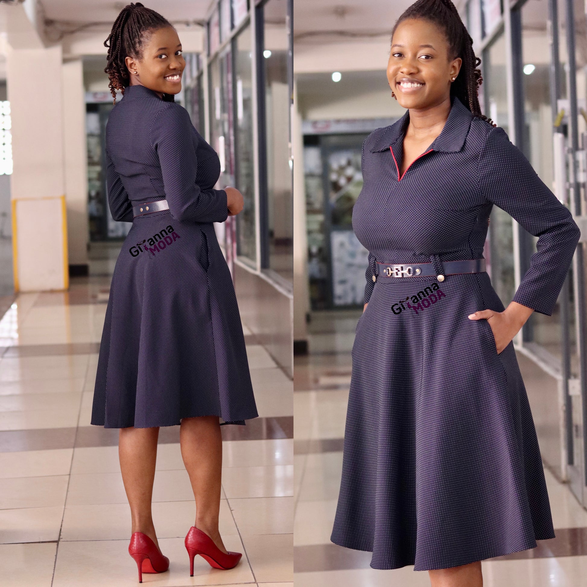 Navy Polka Collared Belted Skater Dress
